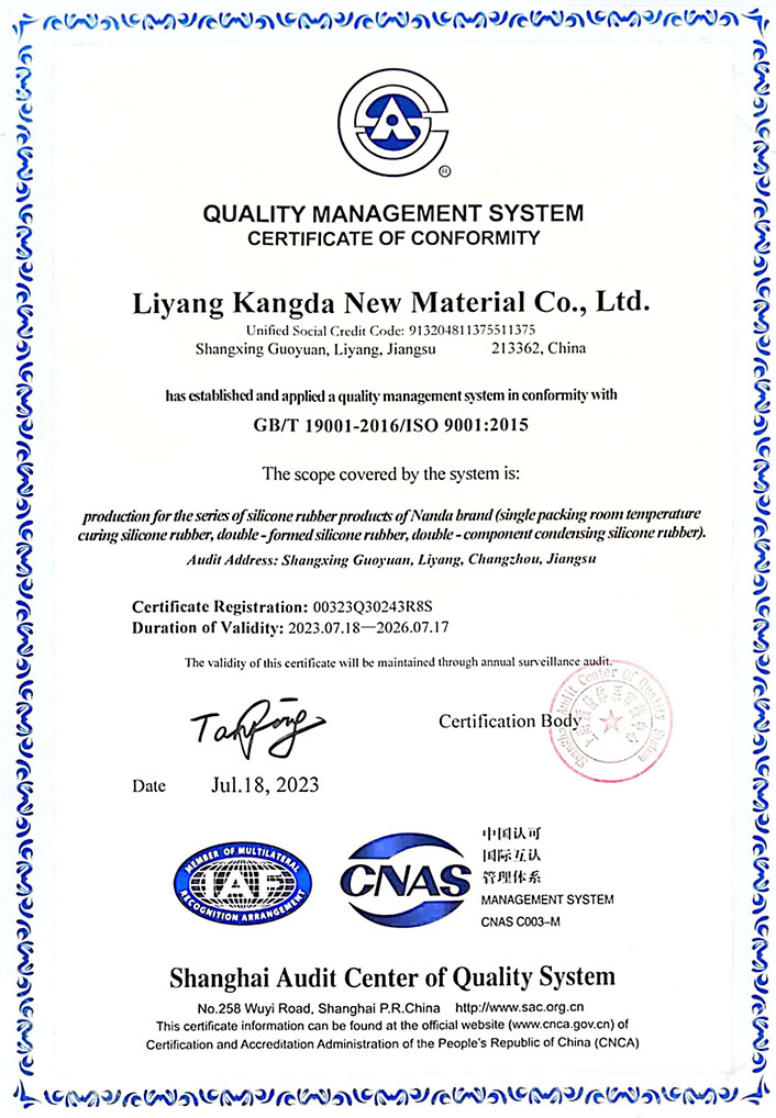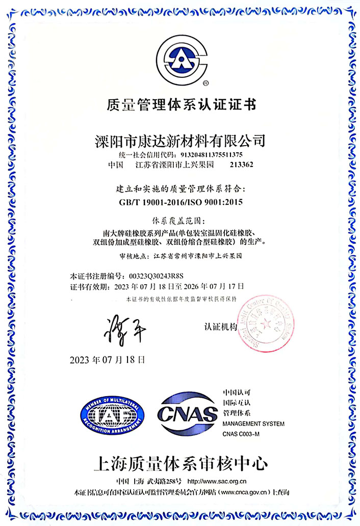 溧陽(yáng)市康達新材料有限公司 質(zhì)量管理體系認證證書(shū)